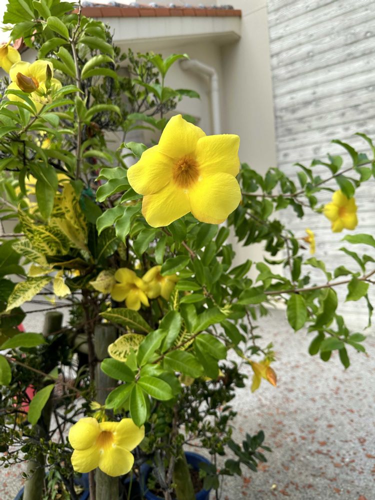 沖縄の、やちむん通りで見つけたハイビスカスみたいやけど、ハイビスカスじゃない花!黄色で大きい花で可愛い💕ヒメアリアケカズラという花だそうです。
