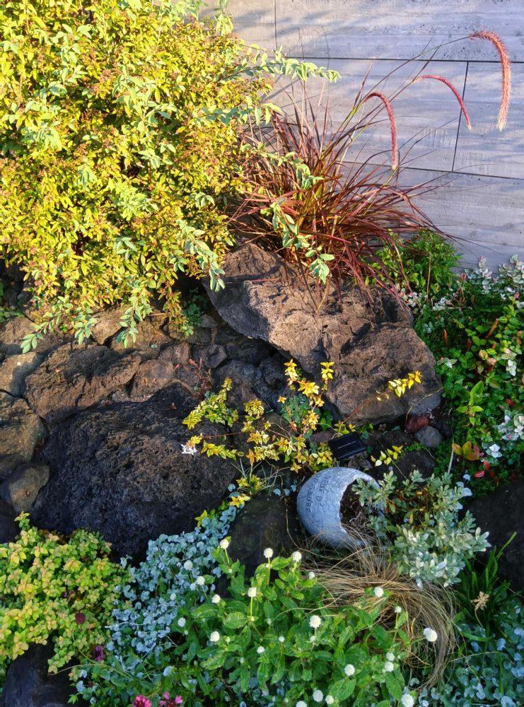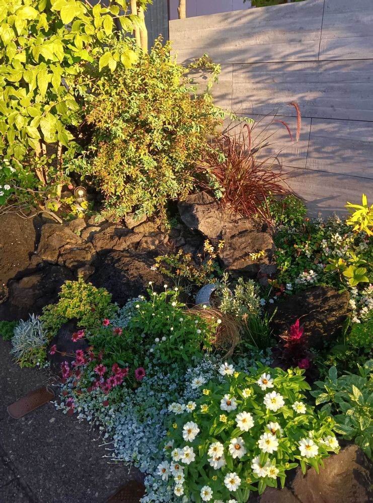 流れるようにお花たちが咲いていて、横たわっている鉢からも緑が🌿