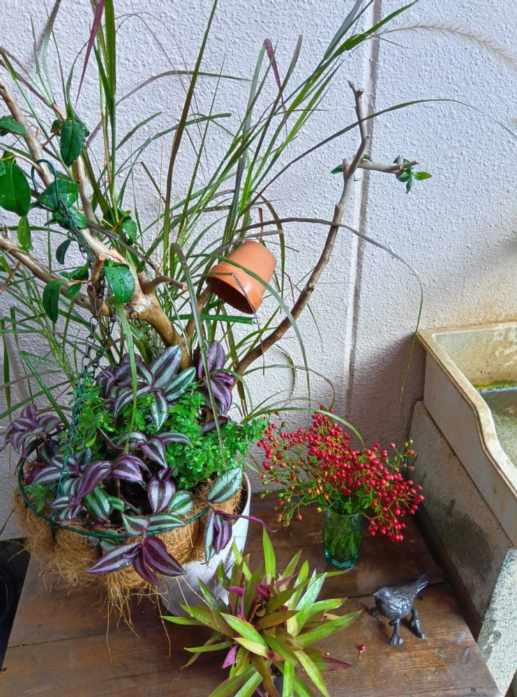 ぶら下げる所に迷った🧺と、枯れ枝と、捨てるに困っていた古くて重い残土で、出来上がったよ〜🙌