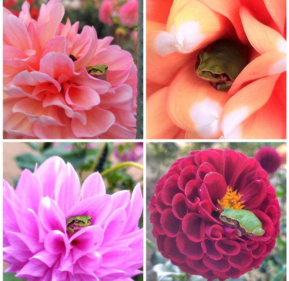 ダリアの花布団でまったりしている🐸🐸🐸凄すぎる🤗