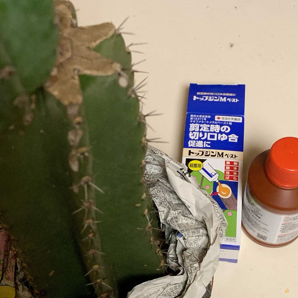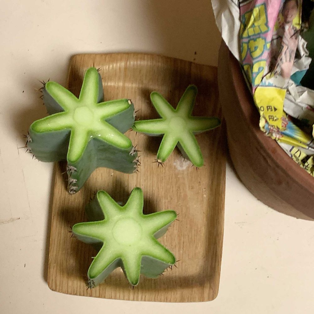 包丁持ってぶるぶる震えること数分…サボテンてこんな硬いのか、刃が入るも引くも押すもできぬままただただ怖い、嫌な感触を包丁持つ右手に感じ、そして左手は鬼面角からの反撃だあー!園芸用手袋なのに棘貫通、痛い!