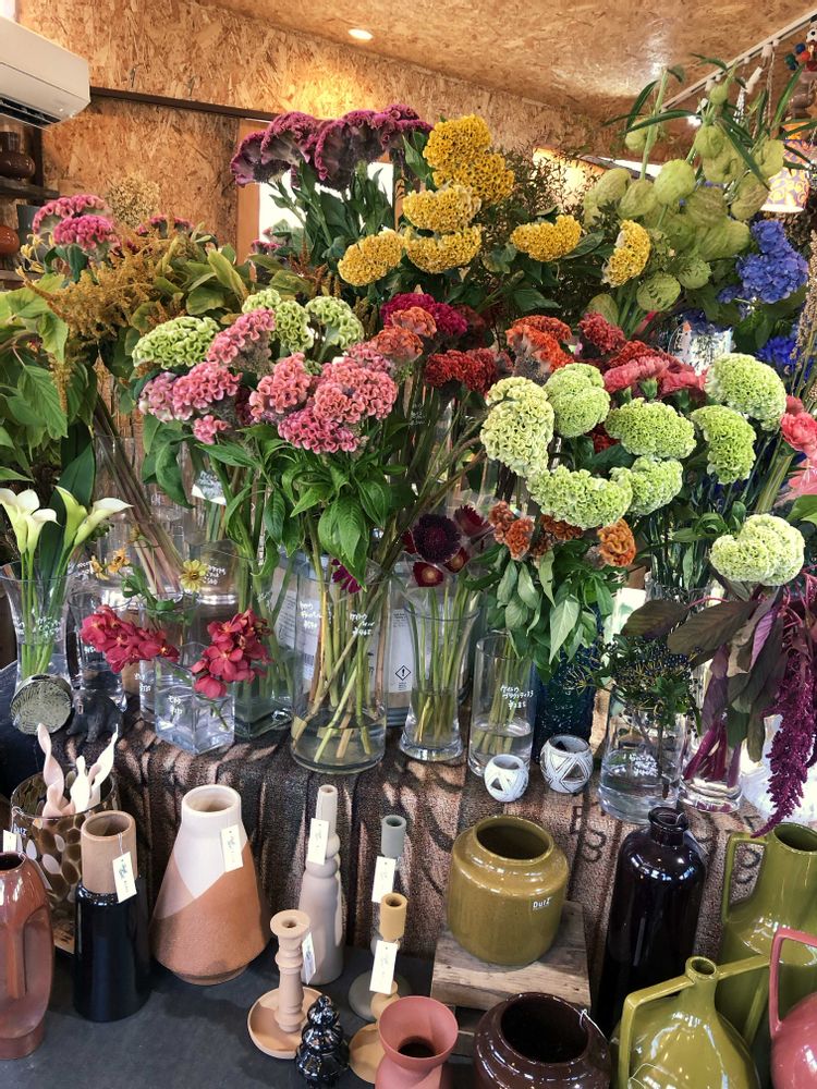 おしゃれなお店ですね😍ケイトウはビロードのようなモフモフ感が暖かそうでいいですね💕花瓶も色んな種類があってこれから部屋に飾ることも多くなるので欲しくなりますね🥰