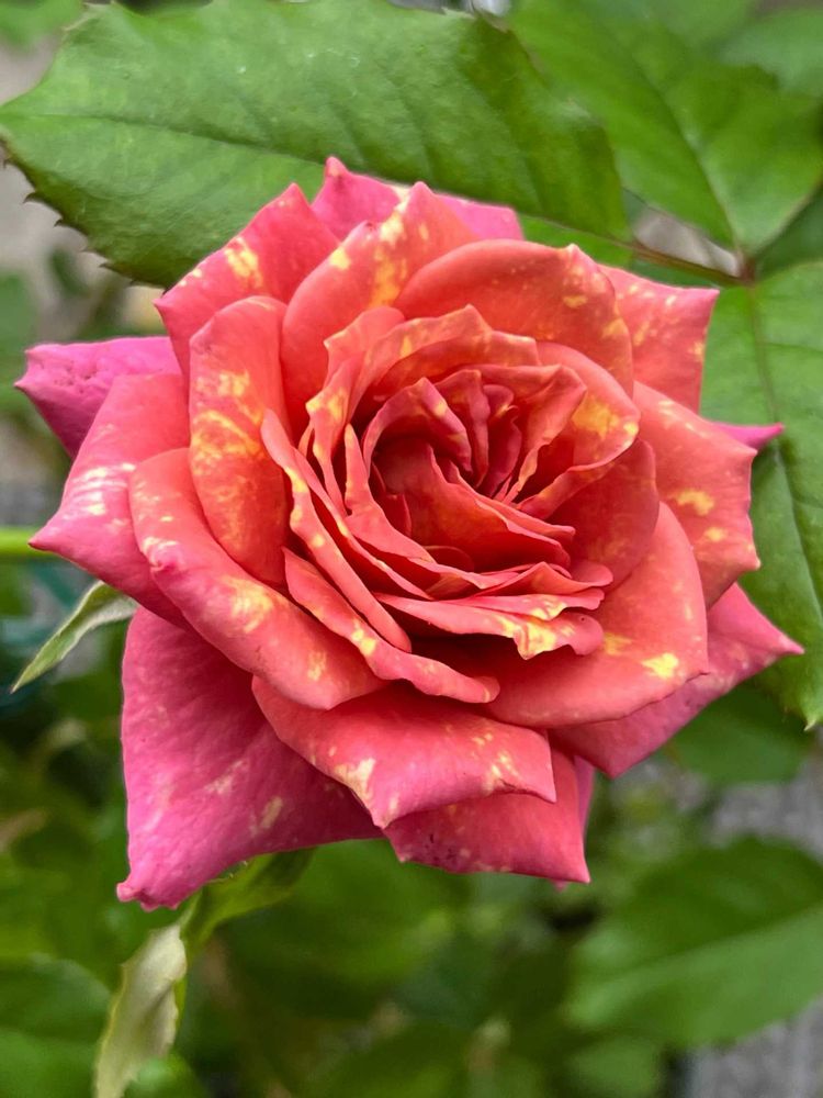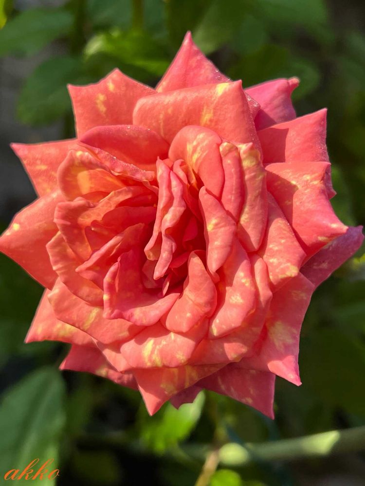 茶色っぽいオレンジの縞模様入りで素敵なバラ