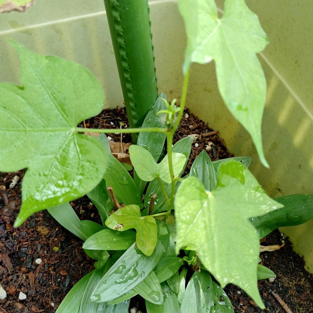 ネジバナの葉の間から出てきていたアサガオ(9/11投稿してる)が今も伸びていて蕾もつけてます