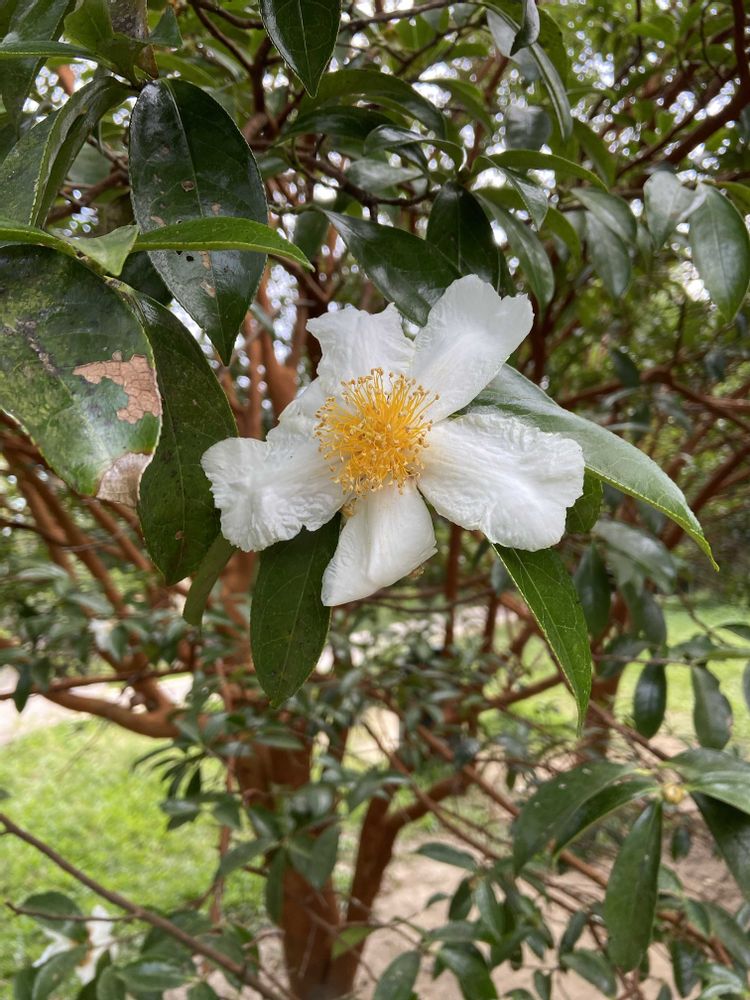 先程投稿した赤茶色の木に咲くツバキの花は白🤍