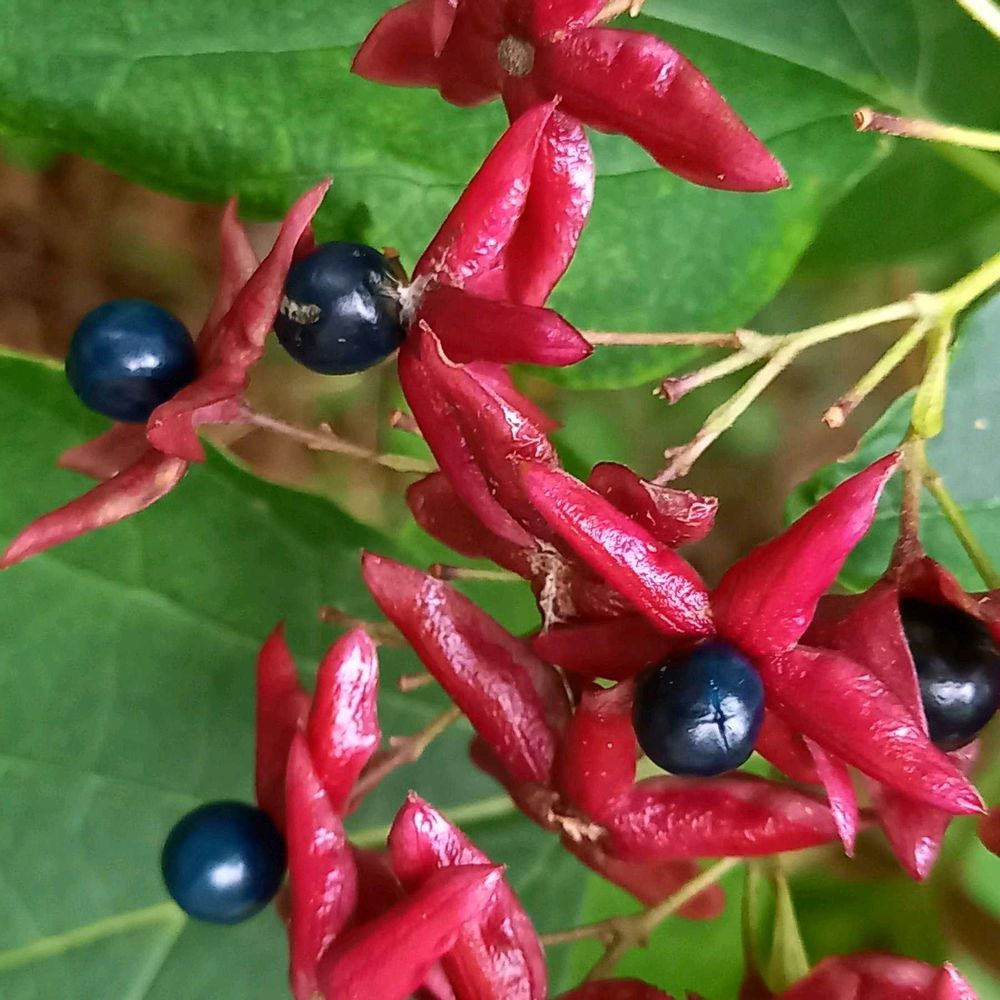 空色から濃青色、黒色のツヤツヤした実と真っ赤な星型の萼片はとても目につく。
