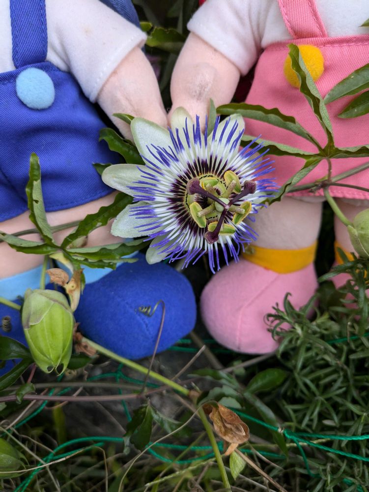 ペコちゃん&ポコちゃんがトケイソウの花を見に来てくれました😄