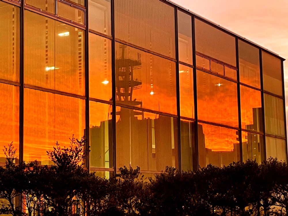 m&oさんの夕方のお出かけ帰り道,山口中央公園NHK前から,図書館の硝子窓に映る夕焼けの投稿画像