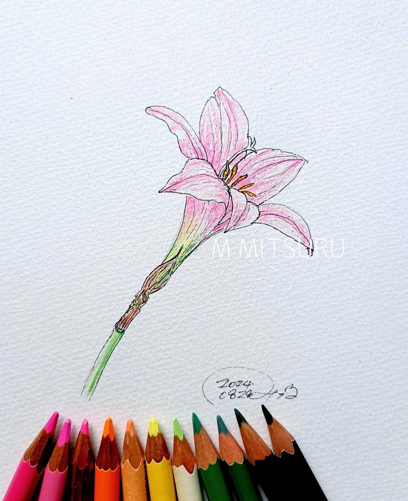 庭で咲いていたゼフィランサスです、投稿画はスマホのバックライトが有るので鮮やかに見えますが実際の色鉛筆画は鮮やかさが有りませんが、それもまたいいかなーと思います。