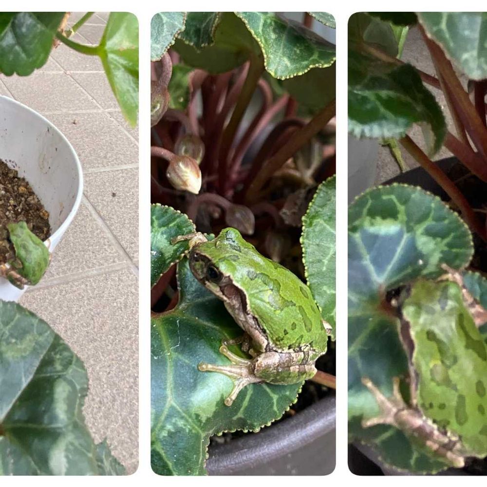 🐸さんは日陰で休んでいたのだと思いますが、写真を撮るのに鉢を動かしたのでびっくりして飛び出しました🐸‼️😅