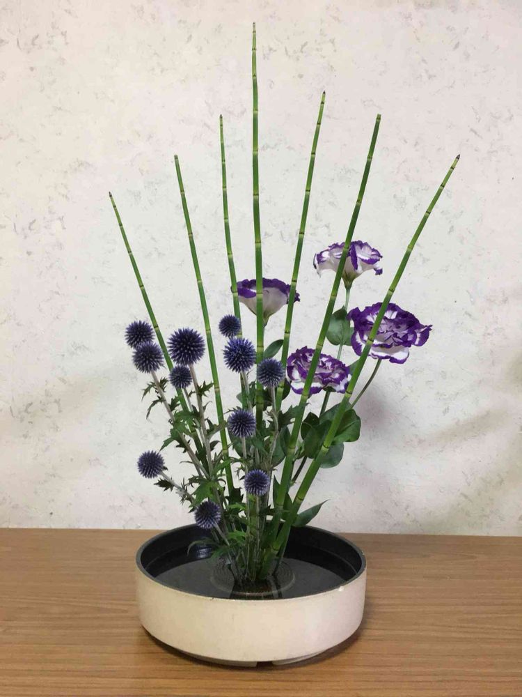 今回の花材、ルリダマアザミ、トルコキキョウ、トクサ