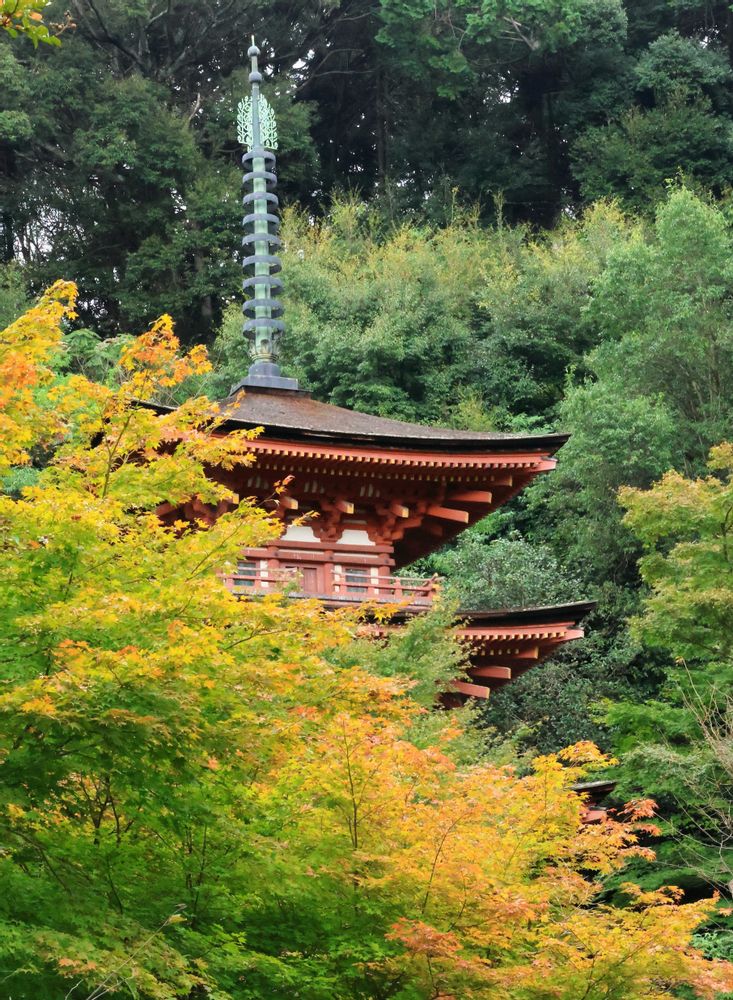 三重の塔を囲む木々は少し紅葉し、塔の朱色とマッチして秋の訪れを感じさせます。
