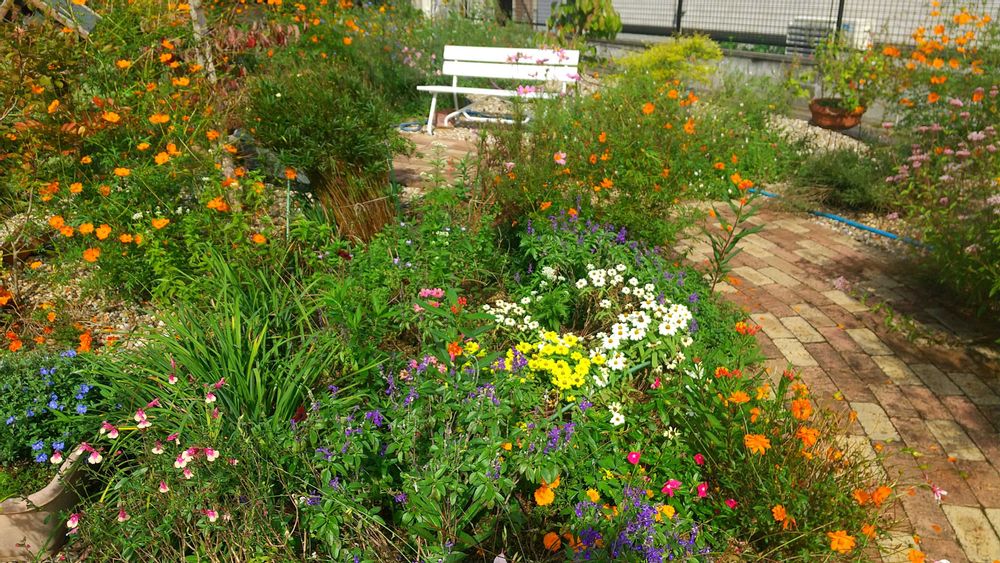 今日の我が家の庭です。雨の後で明るくなりセセリチョウやシジミチョウ、ヒョウモンチョウが飛び回っています。毎日来春の準備で球根植え、種まきなど。🤗🐶✌️