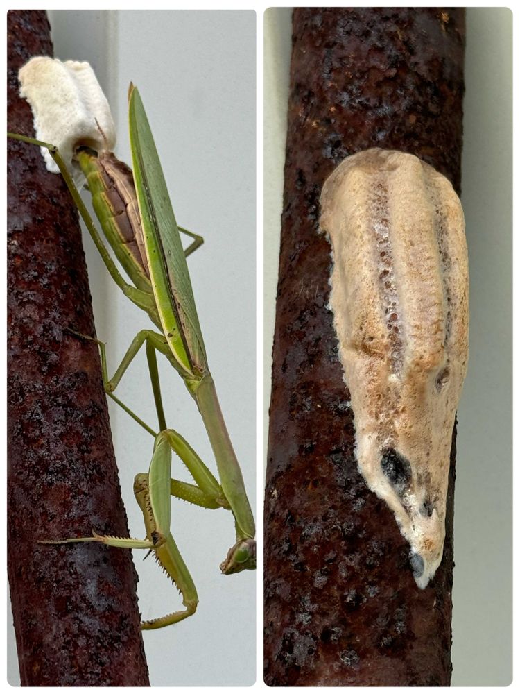 カマキリの茶色くなった卵はよく見かけますが、産卵中は初めてでした😳
