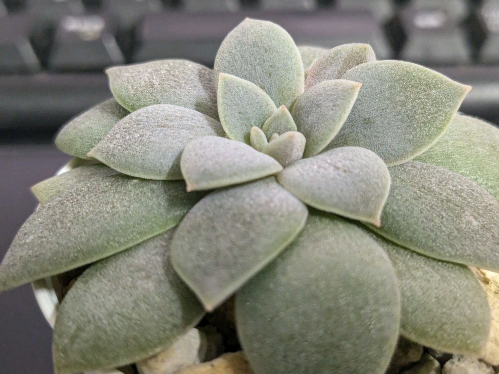 久しぶりの登場、地味枠筆頭の銀明色さんです。成長点とその周りだけ少しだけ(ほんの少しだけw)色味が変わっています。ただ私が水やり大好きでちょっと乾くと直ぐあげちゃうので、基本パッカーんです。可愛くしてあげられずごめんよう😂横から仔吹いてきたジュニア君も元気です💦