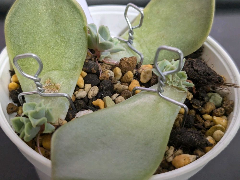 作った葉挿しピック載せ忘れた💦これは早速使ってみたラパスリラの葉挿しっ子です。この子達は根っこがガンガン生えるのでピック無しでも大丈夫だったかもしれませんが、手が当たるたび葉の向きが変わっちゃうので🥳ピックが出しゃばらず良い感じ。番線一本で6つも8つも作れるのでお手軽😁