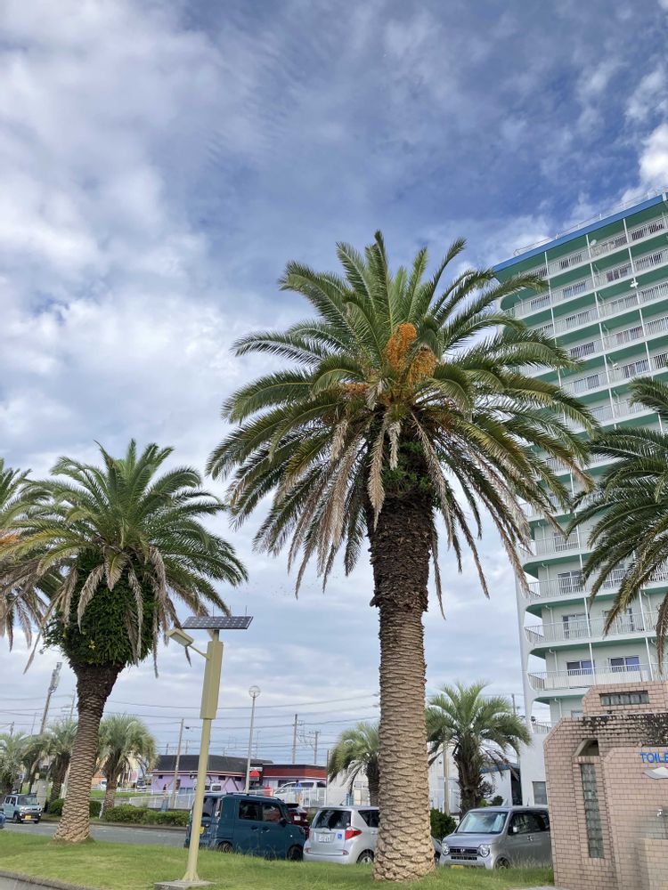 浜松市弁天島海浜公園の赤い鳥居を観に訪ねた 大きなヤシに黄色房が見えたので撮ってみた 小さな柿のようになるようである