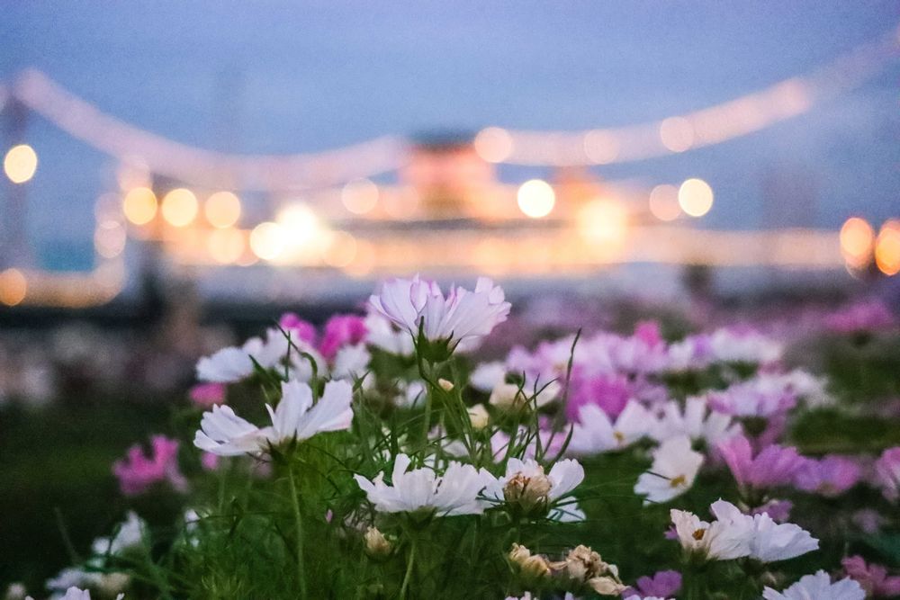 お船の夜景…お船の姿をボカシているので夜景の中で手前のコスモスがキリッとしまって見えます♡