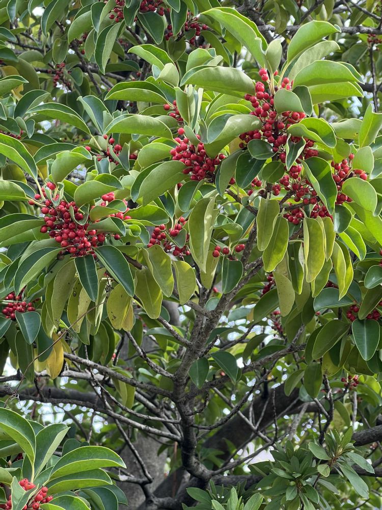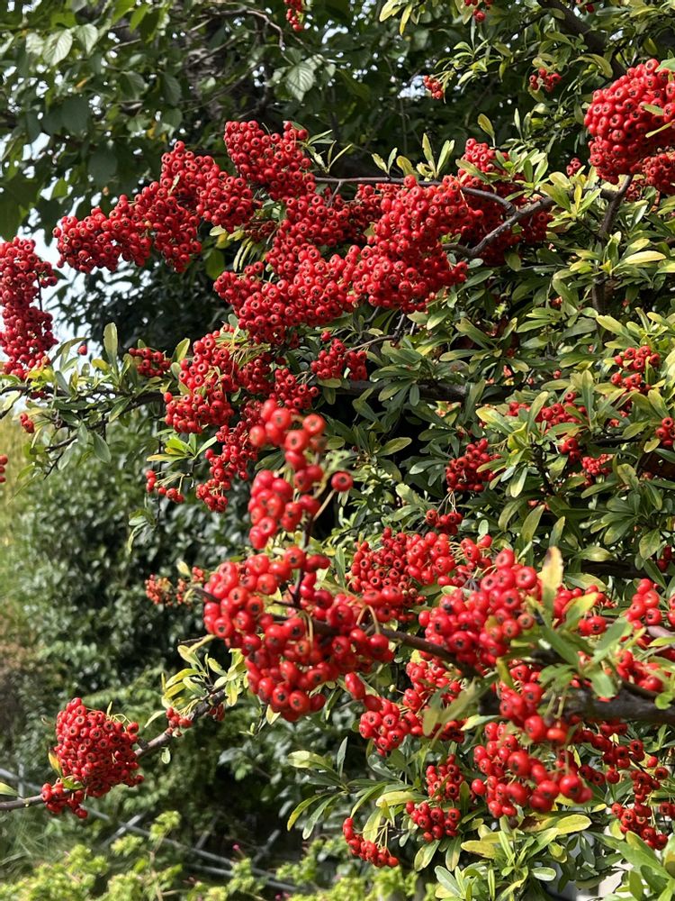 散歩道で赤い実と言えば,ピラカンサ、クロガネモチ、こちらでも、真っ赤になってますね😄シヤリンバイも見ることができますね😉