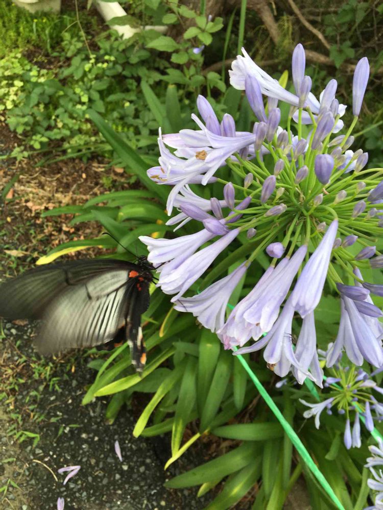 次男坊の幼稚園のお迎えの時に幼稚園に咲いていたアガパンサスの蜜を吸うアゲハを発見❤️