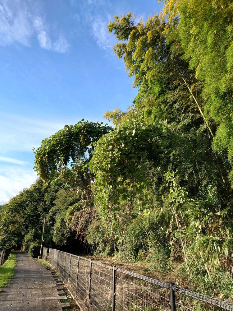 川べりの遊歩道。崖線沿いの竹林からなにか飛び出しています😮 豪快ですね🤭