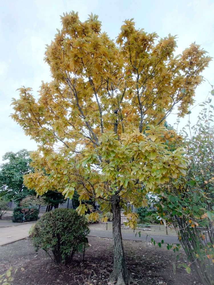 だいぶ黄色くなってきましたね。名札がありませんでしたが、オウゴンガシワのようです🔍️(農業試験場内にて)