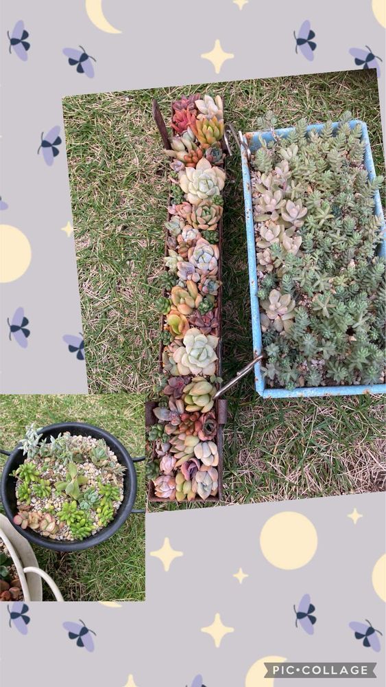 昨日寄せ直した雨どいプランター寄せ🥰ほぼ追加無しでそのまま植え直し出来ました♪根っこはほぼカリカリで、カットして挿ししました😊簡単です。自立しないので、唯一植える時考えないといけないのがネック😅いい感じにサビて、ジャンクになってる🎵同じくハンギングのセダムよせほぼミルキーウェイさんですが、伸びたところをカットして空いてる所に挿し😆また森みたいになるかな🌳↓は色々セダムたちだいぶ枯れて減ったので、まとめました👌