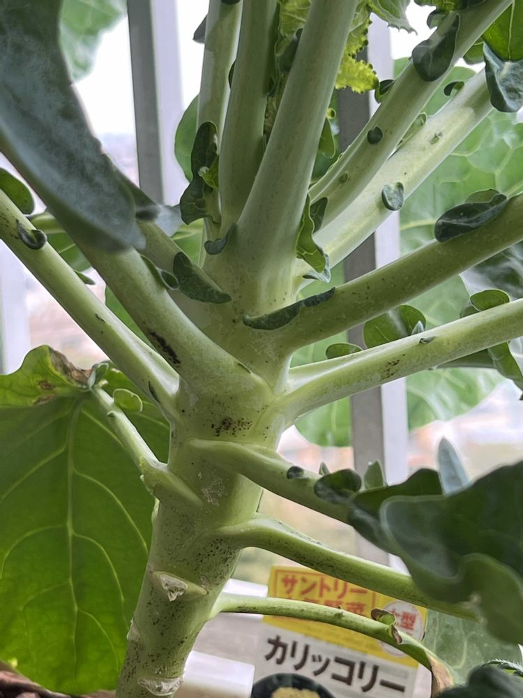 こんばんは🌆茎ブロッコリー🥦ありますが、悲しいかな❗️ショウジョウバッタ❓細長い緑のバッタに食べられました…また、アップします。