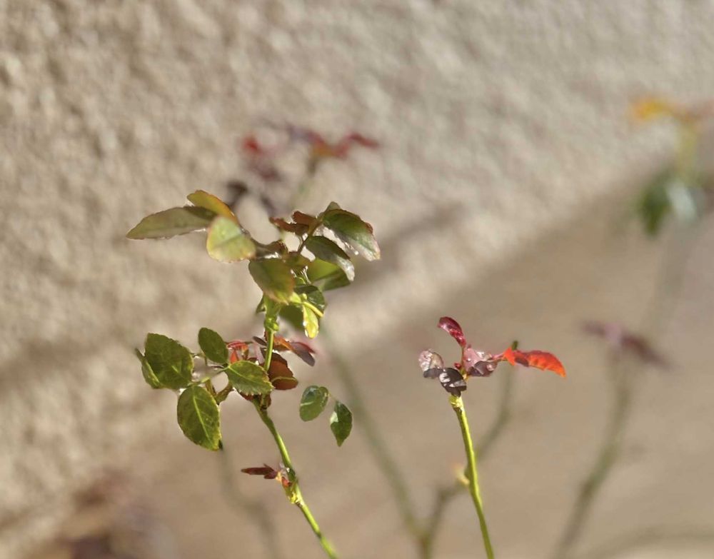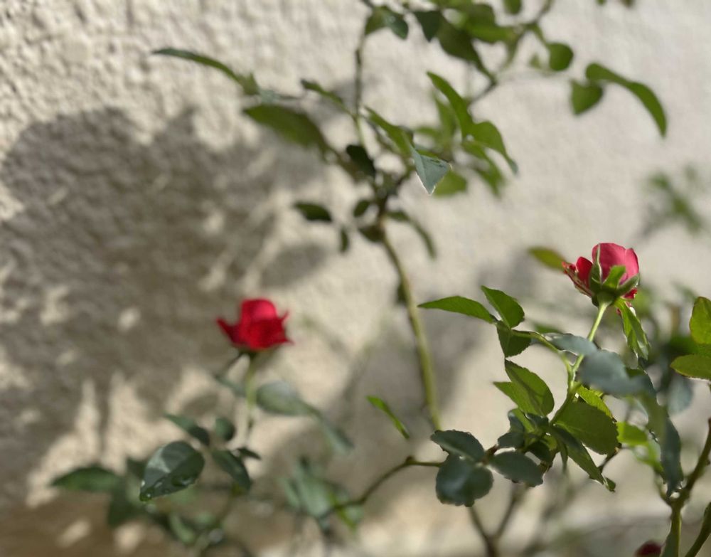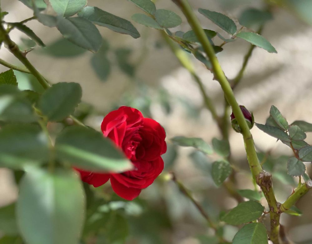 お隣に咲く赤いミニ薔薇は、トュルーブルームの種類で、枯れ枝のようになっていたのをお迎えしていました(8月の終わりか9月に😊)🍂枯れた葉や枝を全部落とし、 しばらく様子を見てから、地植えに🏡