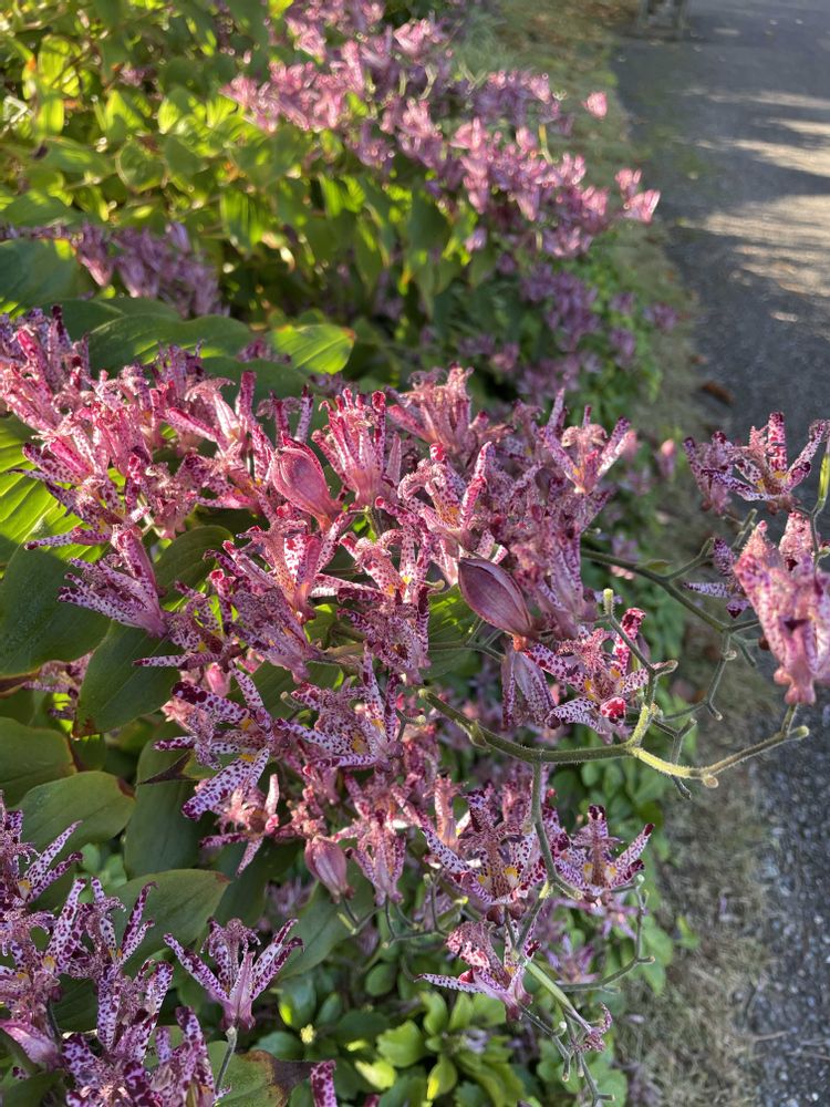 散歩コースにも秋を感じるように😊ホトトギス、ツワブキ、大きなアメリカフウの紅葉