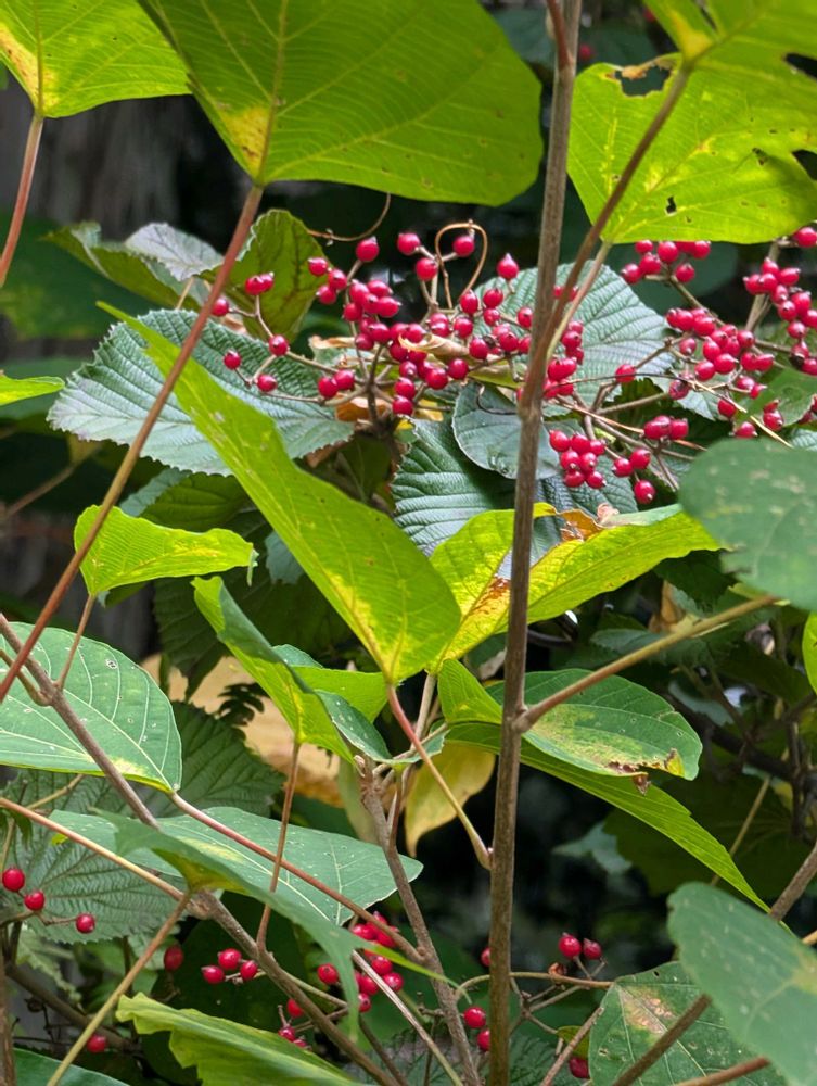 噛む甘酢実〜コバノガマズミと確認してないがたわわなのも一粒なのも なかなか良い葉はオオデマリと識別が困難に感じるが挿し木したものは紅葉始めてる