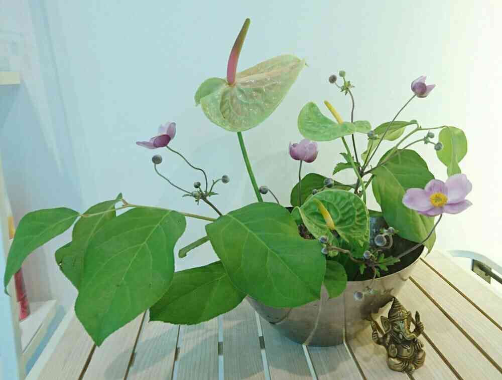 本日のサロンのいけばな。レモンリーフにアンスリュームと秋明菊を浮かべました。
