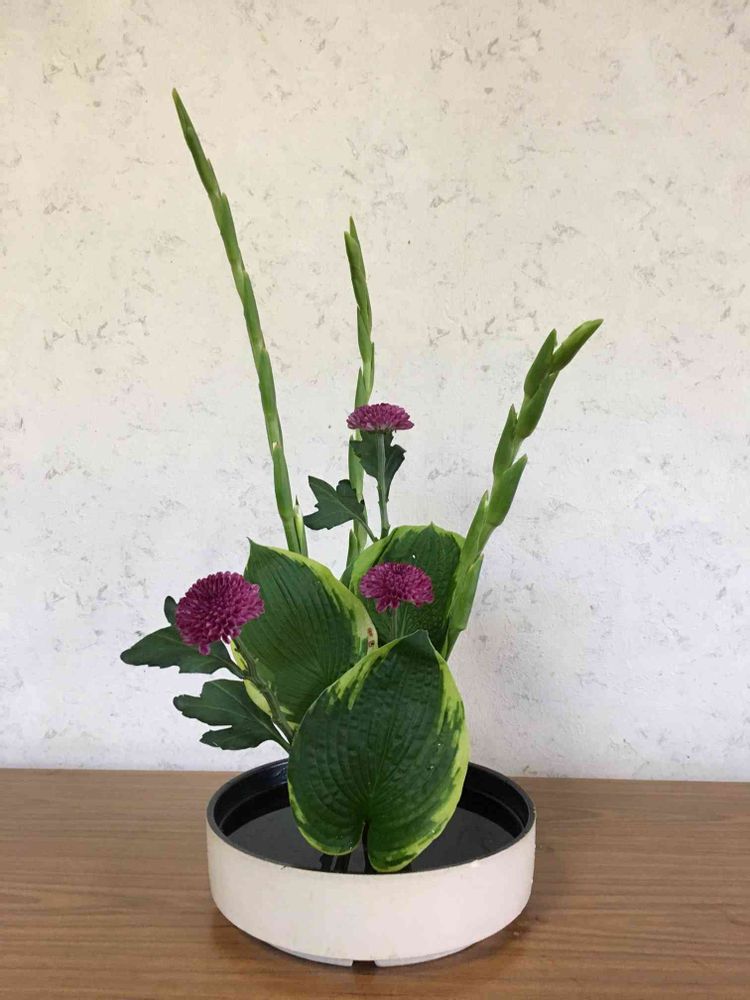 今回の花材、グラジオラス(白)、菊、ギボウシ
