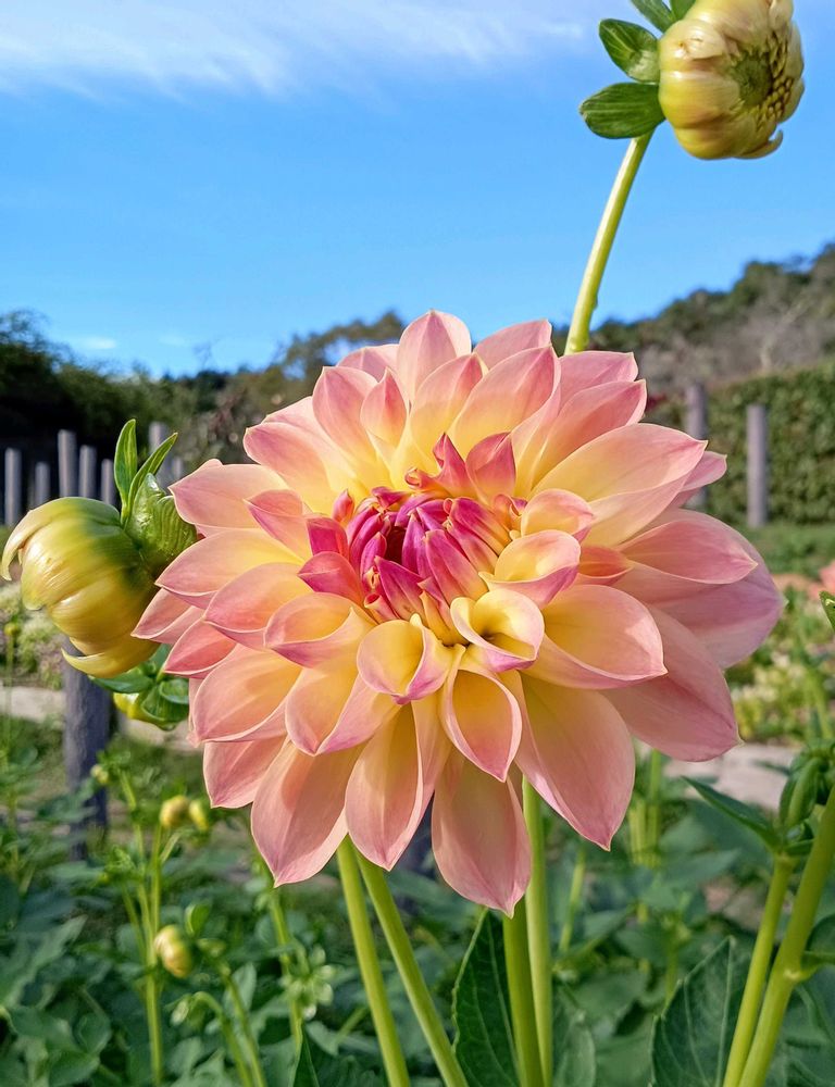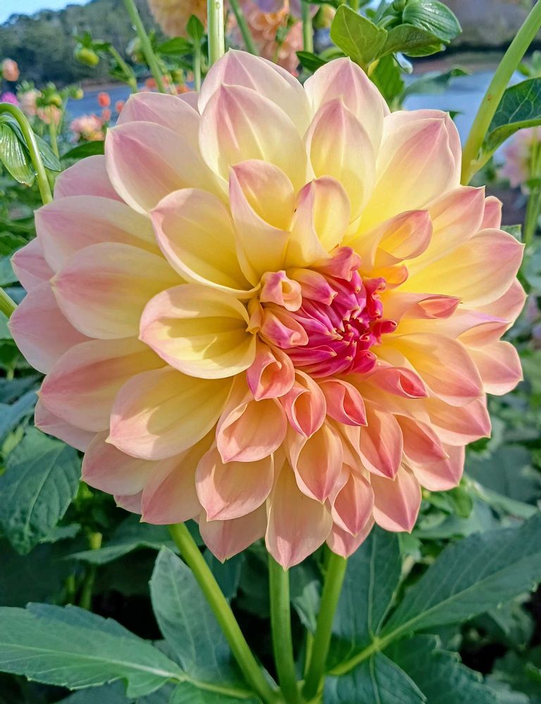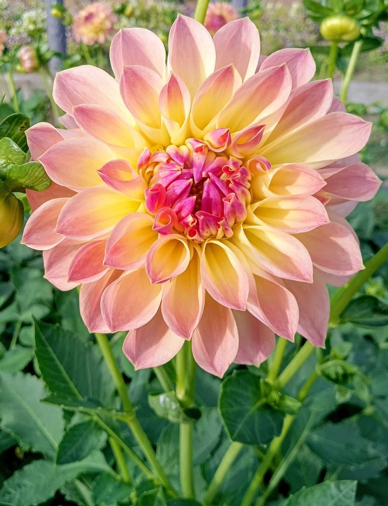 クリームイエローの花弁にほんのりピンクが乗る愛らしい花色のダリアです😊