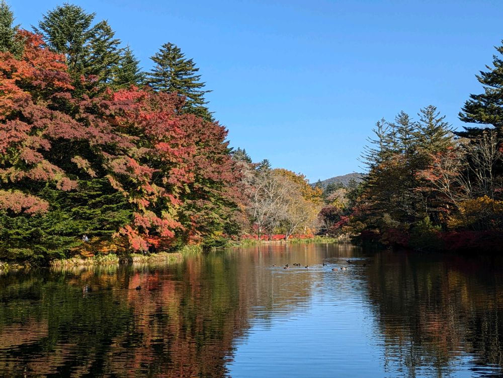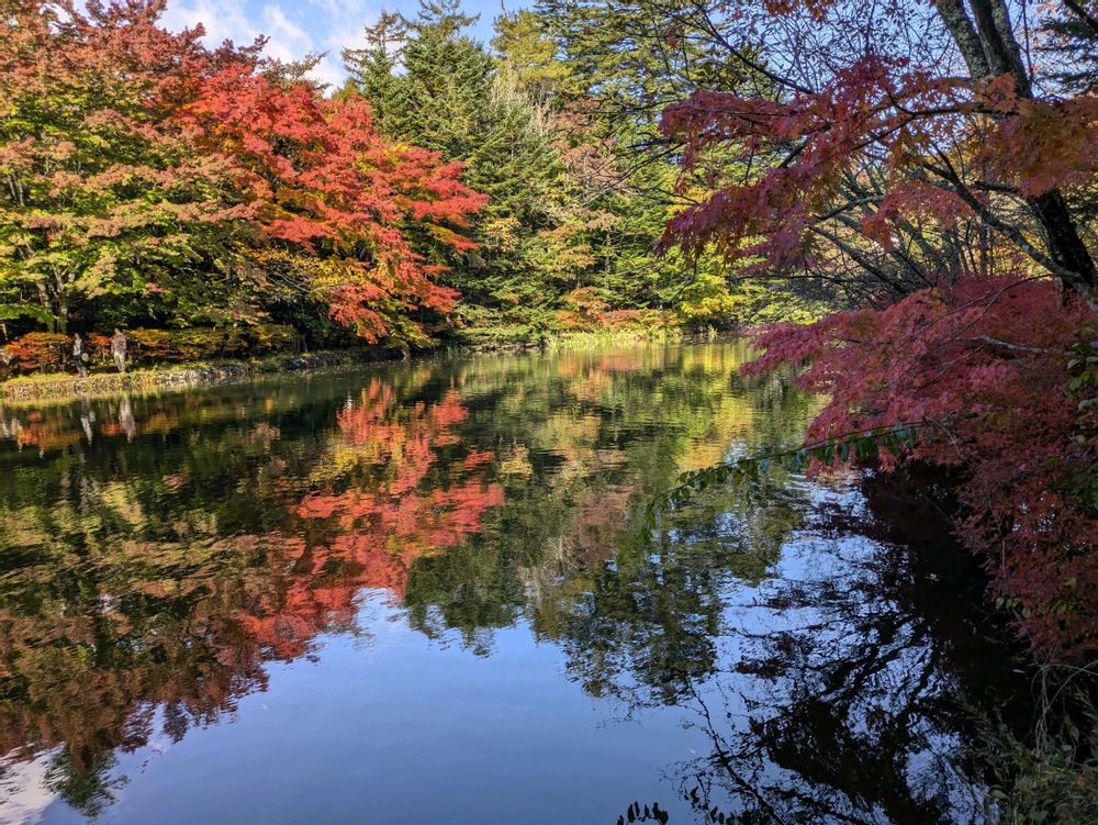 雲場池。ベストはもうちょい先でしたか。でも場所によってはイイ色になってます。青空と紅葉リフレクションがサイコ〜。