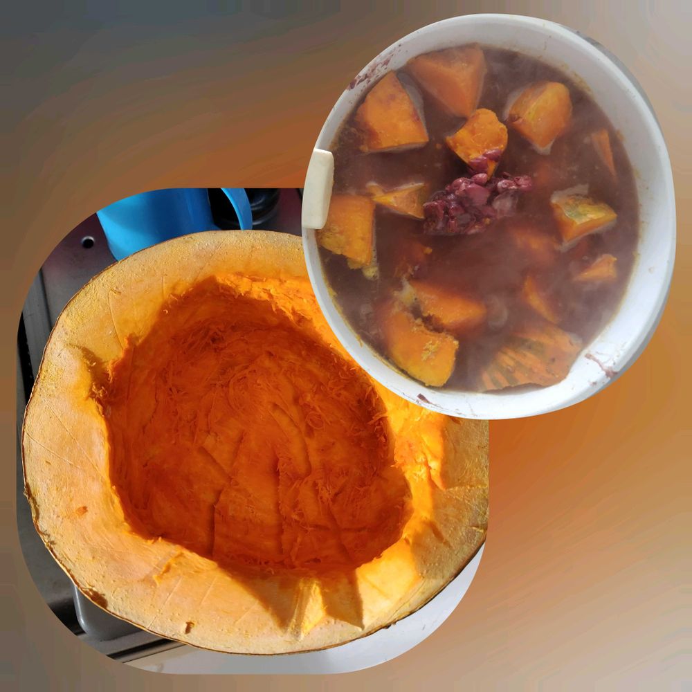 冷凍してた茹で小豆🫘も入れて、冬至かぼちゃ煮の先取りです💦