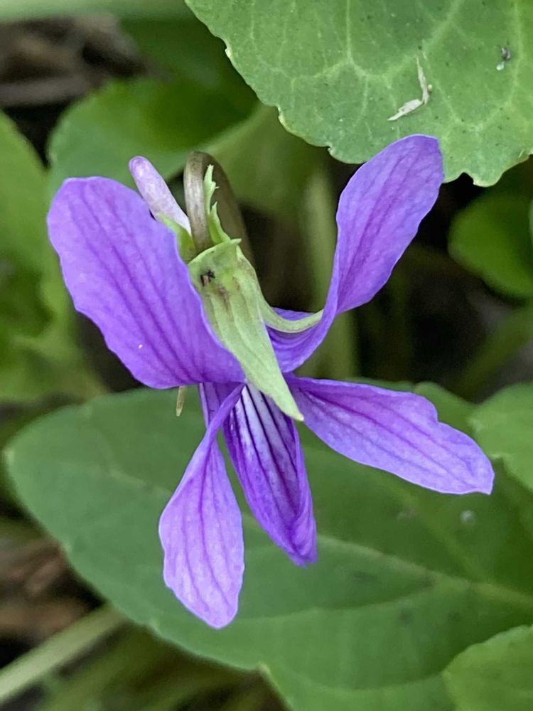 枯れ草の下に美しい菫色を見つけました 枯れ草のお布団は暖かいので顔を出したのでしょうね