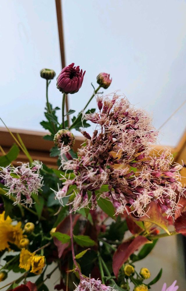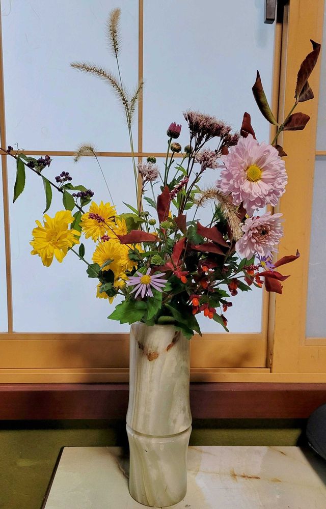 畑の花で,こんなに素敵な生け花ができるんですねー😉素晴らしい👏👏👏