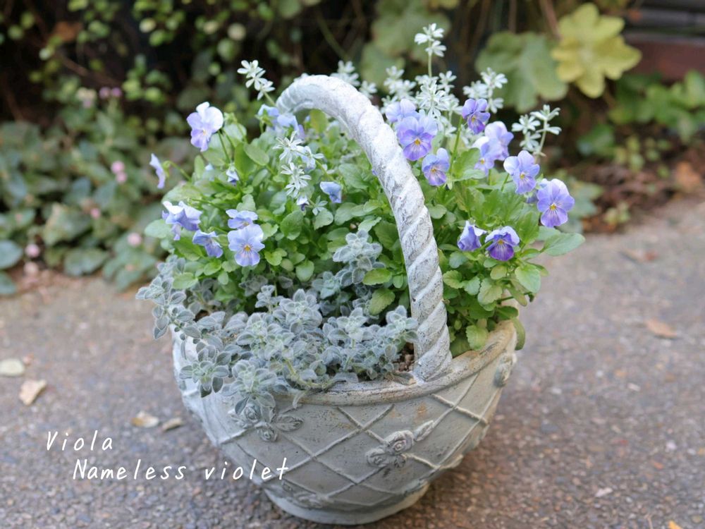 かご風の鉢に寄せ植えしたのは、水色の名もなきビオラ