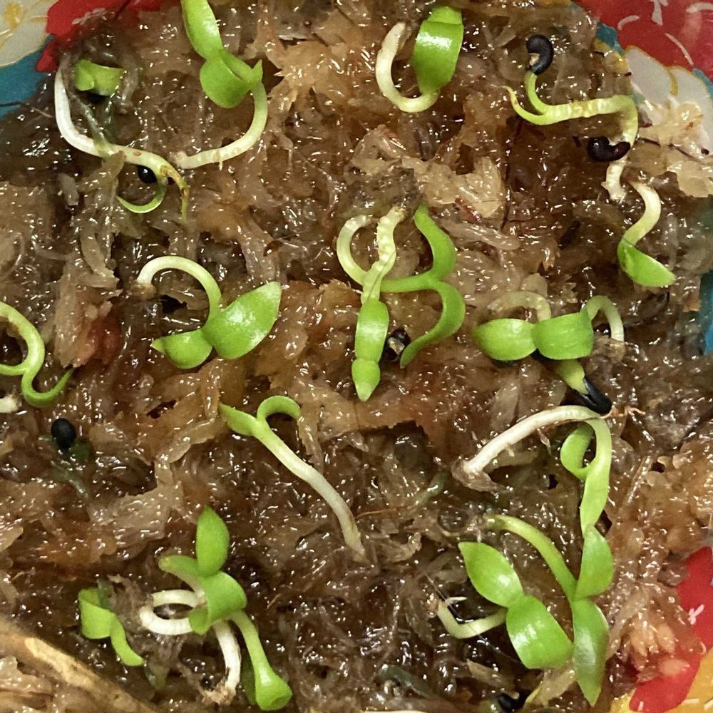 興味津々で割ってみるとふわっとした内側に実はなく種が😳しかも発芽して根っこまで生えてる!(4枚目)慌てちゃって割った時の写真なし😓