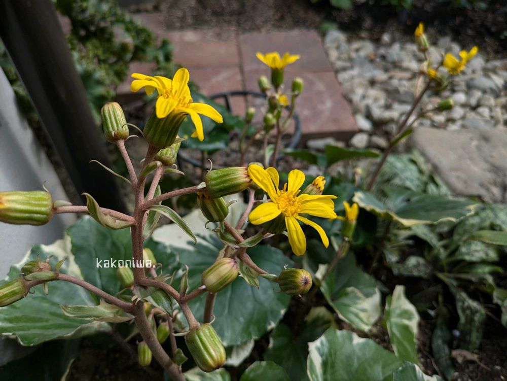 2枚目ツワブキ浮雲錦の花 蕾まで斑入りで可愛い🩷