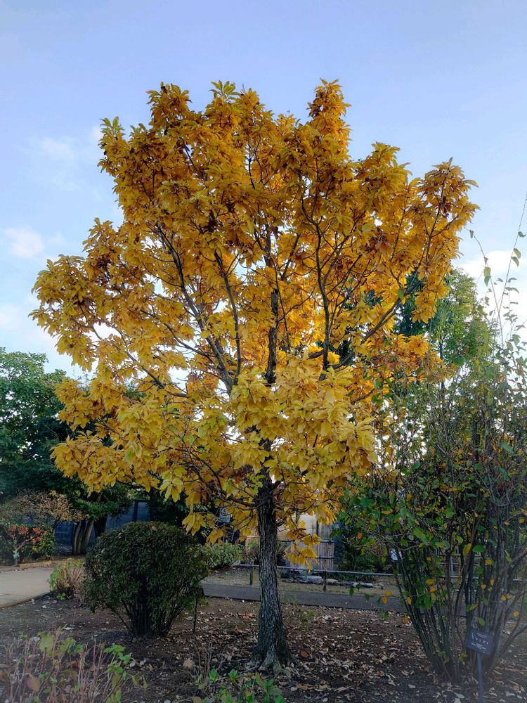 青空を背景に黄金色に輝いていました✨ その名のとおり、オウゴンカシワでした(農業試験場内にて)