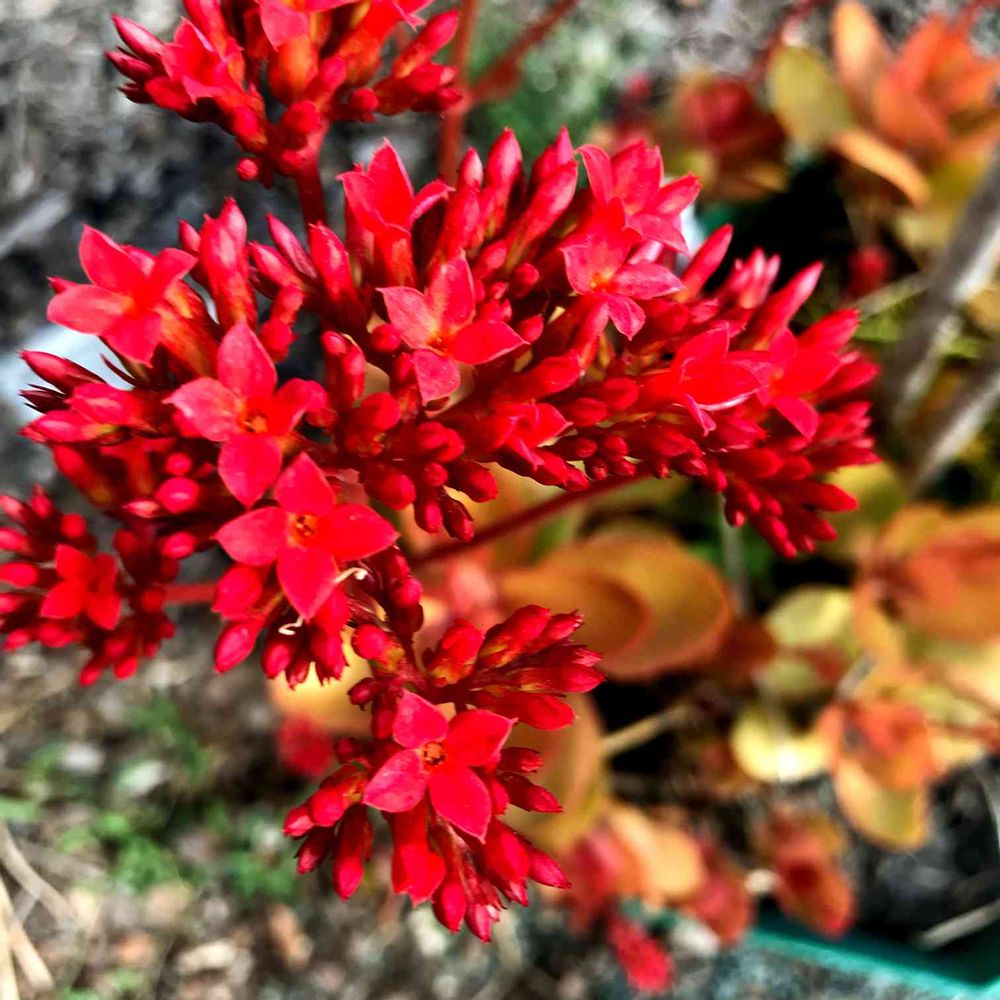 多肉(なんの種類かは名前不明)から鮮やかな花が咲いていました。鮮やかな赤が目を引きます。