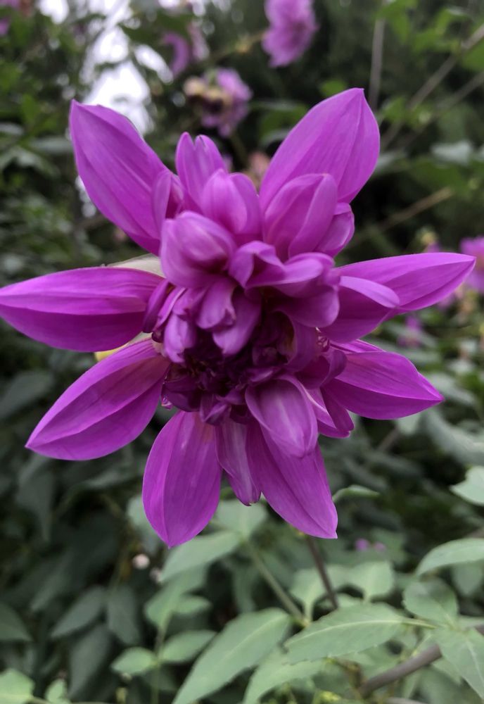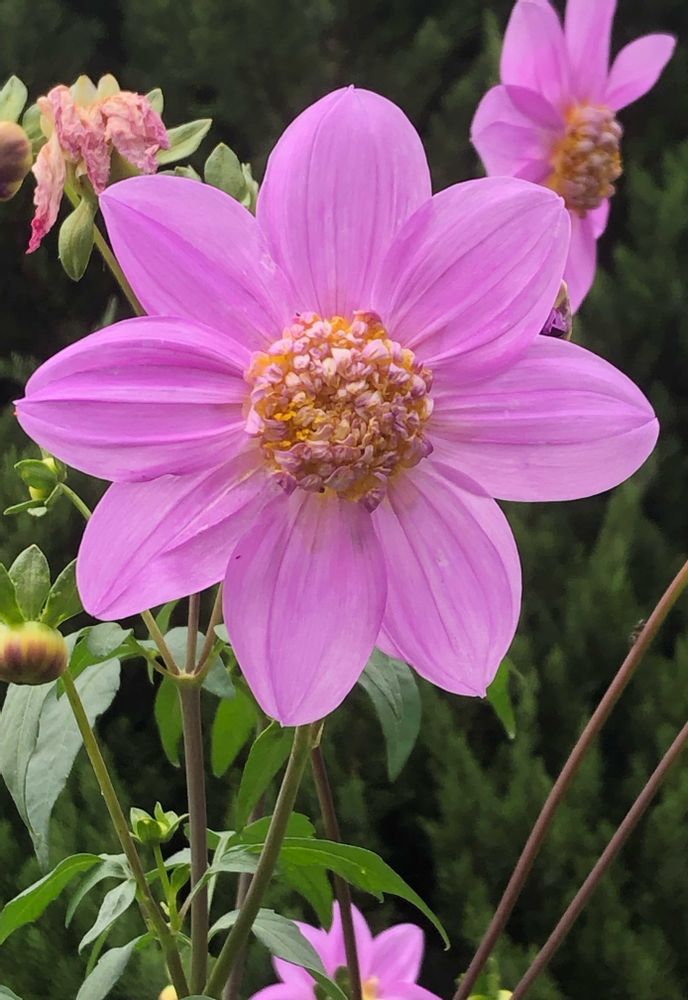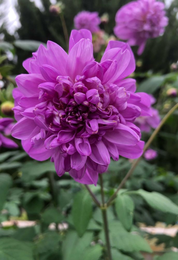 夕暮れ時、道路沿いの花壇にて、八重咲きや一重咲きの「皇帝ダリア」をパチリ!📸💜🌿😄🌇👌