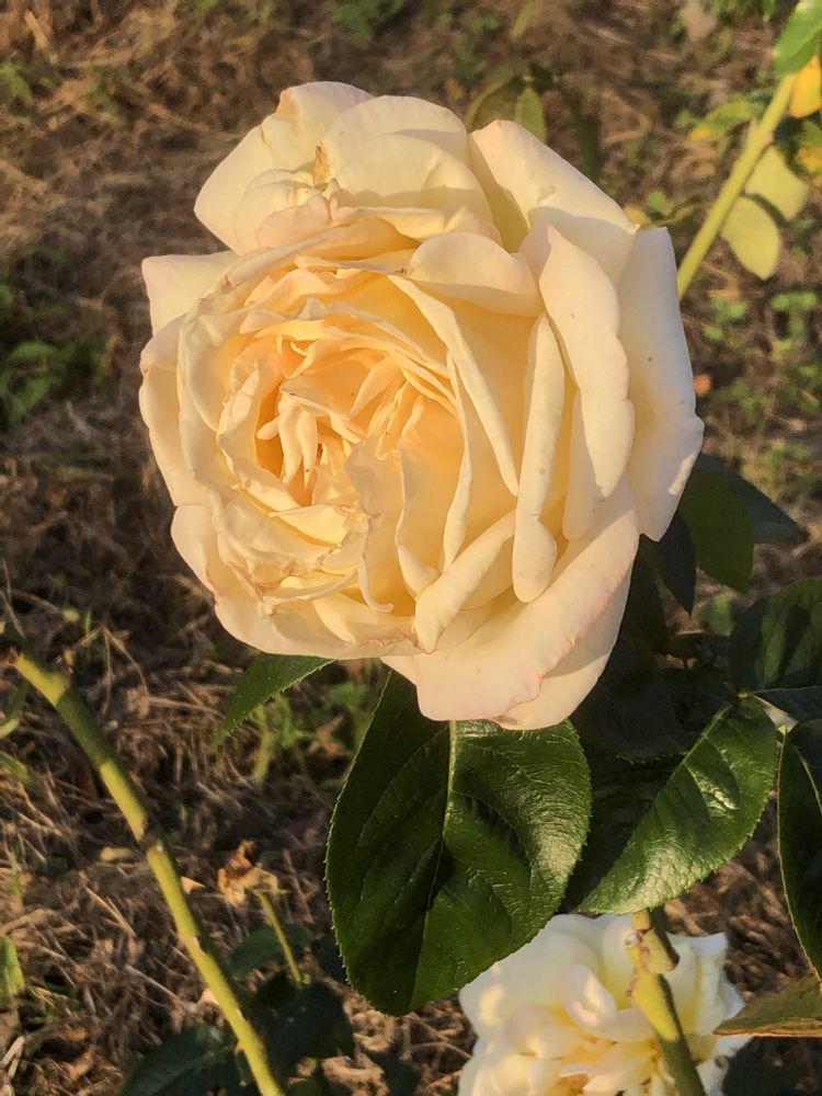 茨木市の若園バラ園にて、夕日に白く輝くフランス🇫🇷製のバラ「ピース」をパチリ!📸🌼🌿🤗😄🌇🌞✌️