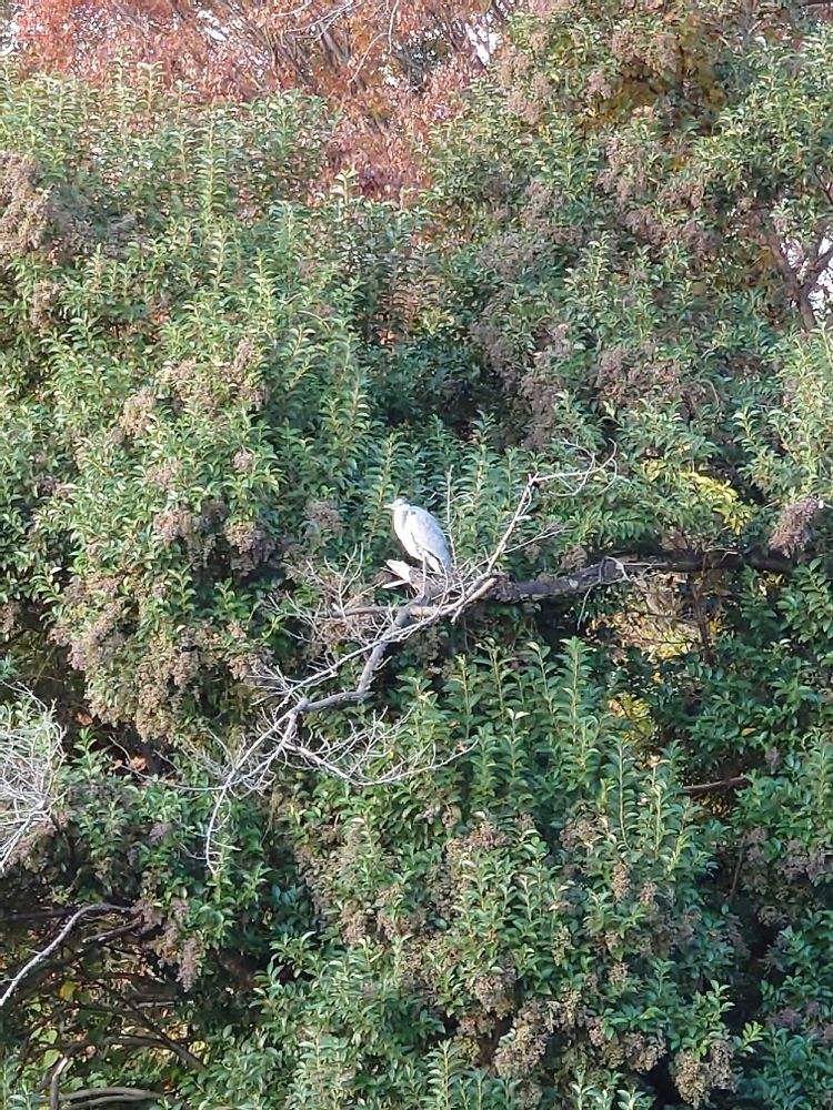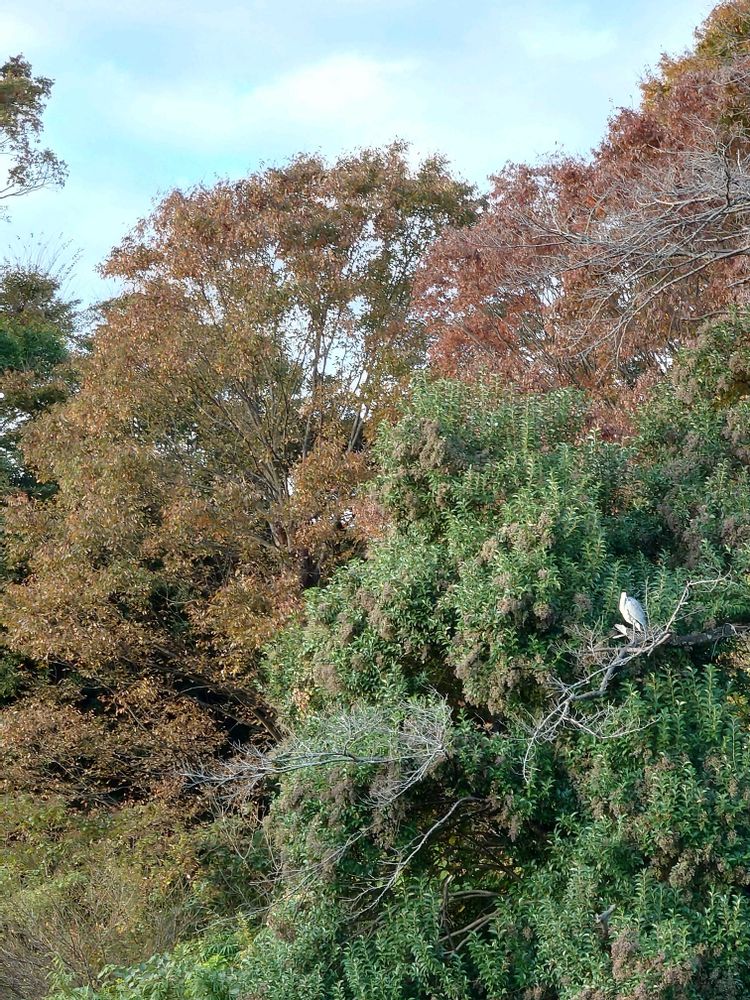 紅く染まり始めた木々🙌 と、右下に何かいますね👀 定住者のサギくんだ😮 この日は川面ではなく、高い木の上で休憩していました😀