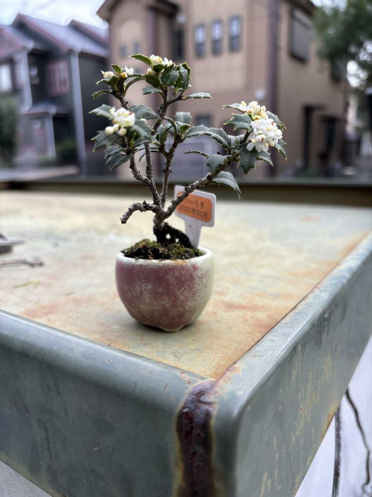 2021年10月から我が家の盆栽棚に置いてある「姫ひいらぎ」です。今年は何とか花が咲きました。このままの大きさで育てたいと考えています。