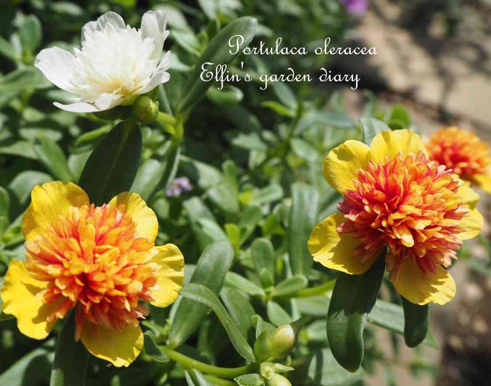 近くのHCで68円コーナーにあった八重咲きポーチュラカ。白のポーチュラカを1ポットだけ買ったら、何故か白の八重咲きポーチュラカと同じポットに黄色と赤の八重咲きポーチュラカが咲き始めて…