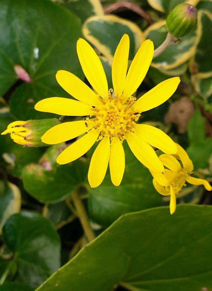 ⑤ツワブキ(キク科)我が家の花海棠の下 日陰で咲く、ビタミンカラーの健気な子です💛🌱