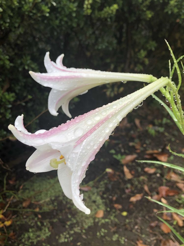 5️⃣ もう一本のテッポウユリ 小雨の日、花弁に赤い筋が入っています、寒いから?🤔 と思っていたら、教えて頂きました😃タカサゴユリでした❣️赤い筋が目印ですね🤍💕